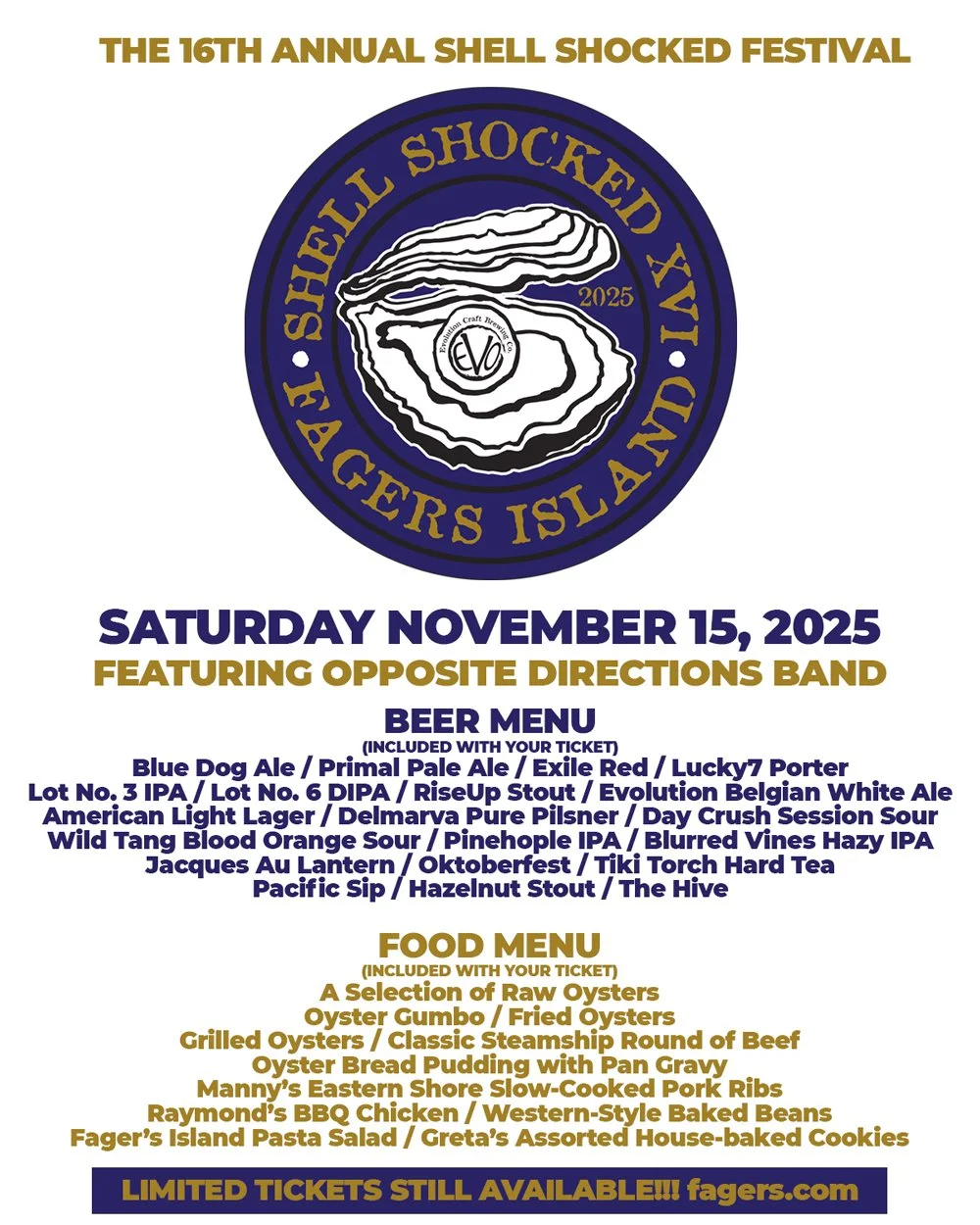 our 16th annual SHELL SHOCKED CRAFT BEER AND OYSTER FESTIVAL WILL BE HELD ON NOVEMBER 15, 2025. LIVE MUSIC BY OPPOSITE DIRECTIONS BAND.