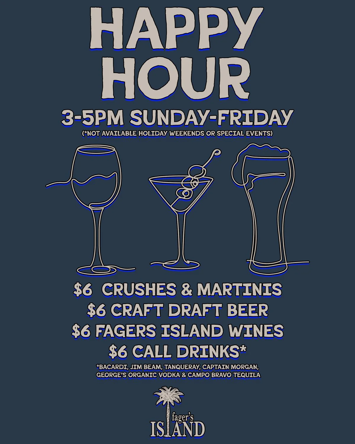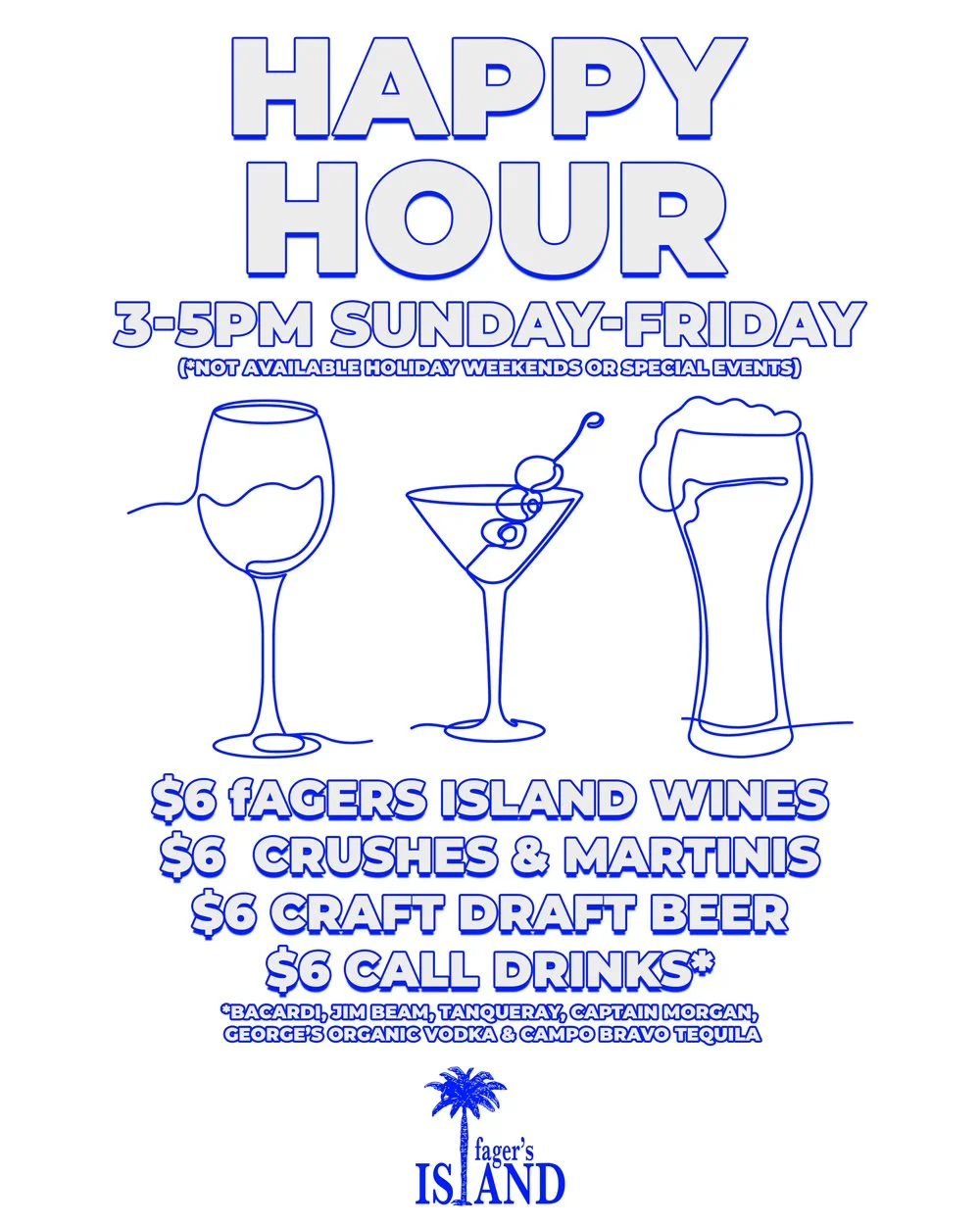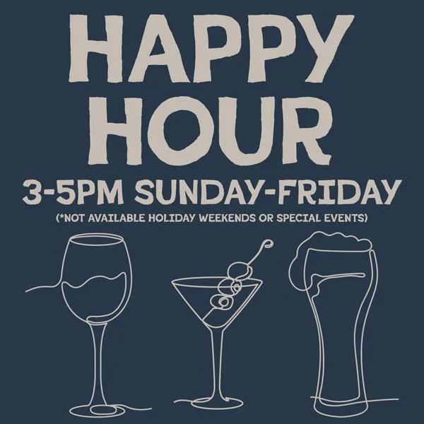 $6 Beer, Wine, CRUSHES, MARTINIS and Select Cocktails 3-5PM SUNDAY - FRIDAY. (Not available holiday weekends, MONDAYS or special events)
