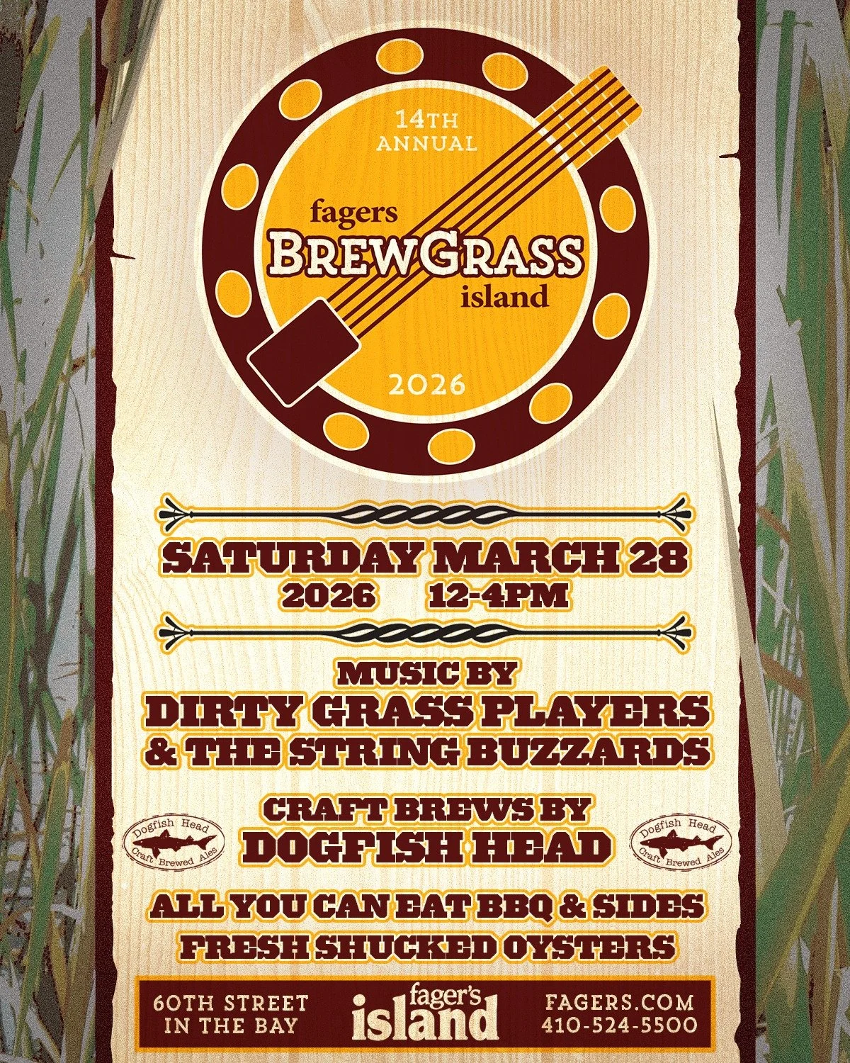 March 28, 2026 FROM 12-4PM. Bluegrass MUSIC, DOGFISH HEAD CRAFT Beer, Oysters & BBQ on the bay in Ocean City MD